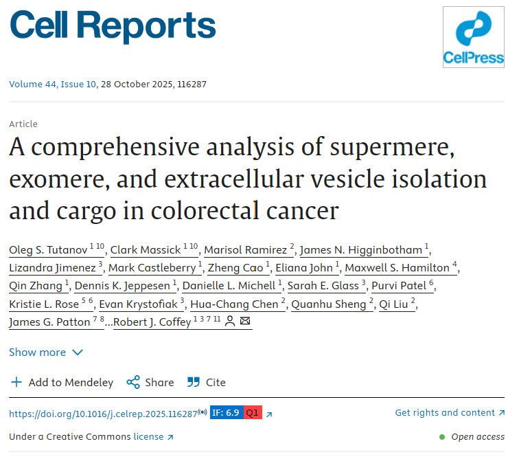 Tutanov OS, Massick C, Ramirez M, et al. A comprehensive analysis of supermere, exomere, and extracellular vesicle isolation andcargoin colorectal cancer.Cell Rep. Published online September 17, 2025. doi:10.1016/j.celrep.2025.116287