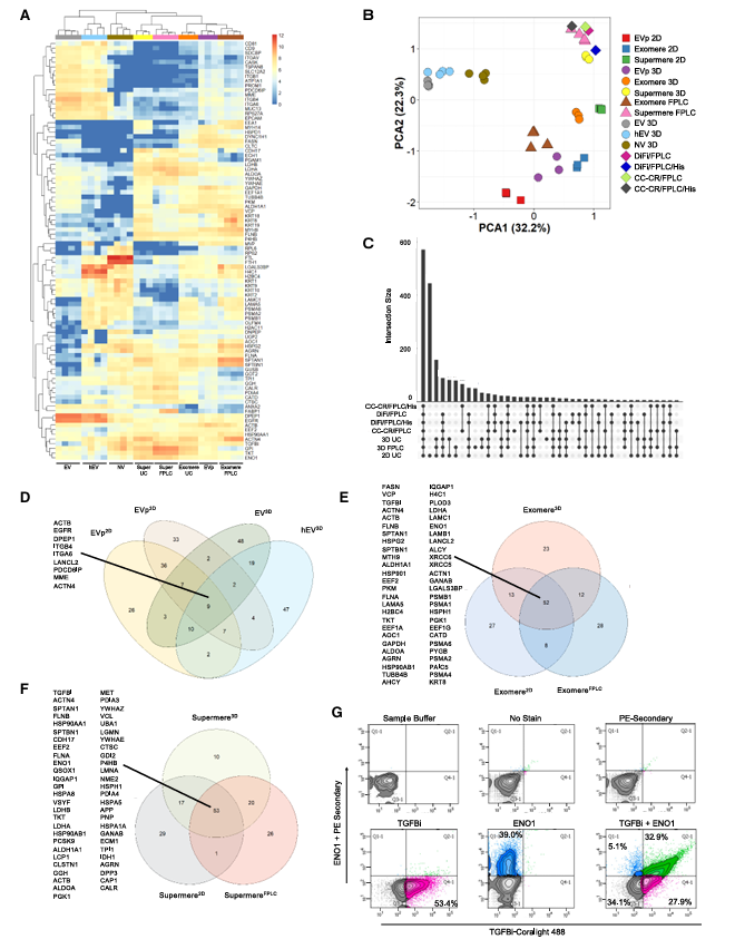 蛋白质组学分析显示,EV、外微粒和超级微粒的蛋白谱具有显著差异性,且该差异性不受培养方式(2D/3D)和分离方法(UC/FPLC-SEC)影响。EV富集ALIX、TSG101等囊泡标志物及完整跨膜蛋白,外微粒和超级微粒则富集代谢酶(如ENO1)、切割的跨膜蛋白胞外域(如DDR1-ECD)及TGFBi等。流式荧光激活囊泡分选(FAVS)分析发现,53%的超级微粒含TGFBi,39%含ENO1,33%为双阳性,体现超级微粒的异质性。研究还通过His标签亲和纯化,成功分离出TGFBi阳性的超级微粒,为后续功能研究提供工具。