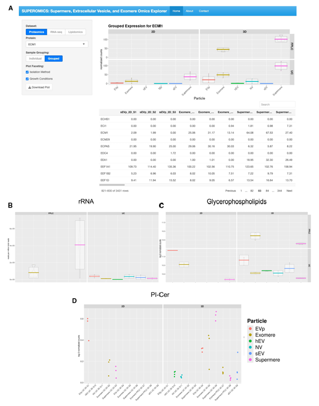 为方便科研人员利用研究数据,团队开发了在线多组学查询工具(https://superomics.shinyapps.io/browse/),可查询不同培养/分离条件下各载体的蛋白、sRNA和脂质数据,生成可视化图表,为后续研究提供数据支持。
