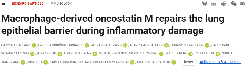 "我们发现,肺部的巨噬细胞会产生一种名为制瘤素M(OSM)的生长因子,它能够快速修复肺部的上皮屏障,"Franklin说。"这种快速修复极其重要,因为在肺部,如果没有这个屏障,你就更容易受到外部环境的影响。"