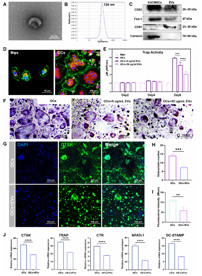 研究团队首先对人脐带间充质(hUCMSC)及其来源外泌体(hUCMSC-EVs)进行了表征:hUCMSC呈梭形贴壁生长,高表达CD90、CD73、CD105等干细胞标志物,且具备成骨、成脂、成软骨的多向分化能力;通过超速离心法分离的hUCMSC-EVs,经透射电镜观察呈典型杯状或球形双层膜结构,纳米颗粒追踪分析显示其粒径峰值约126nm(主要分布于80-200nm),Western blot证实其表达CD63、Flot-1、CD81等外泌体特异性标志物,不表达内质网标志物Calnexin,且可被破骨细胞和巨噬细胞成功摄取。