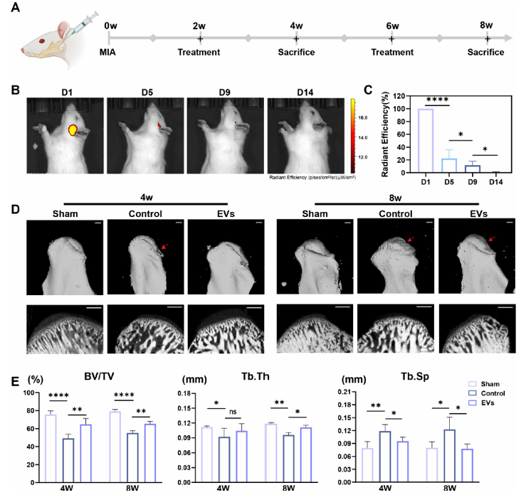 为验证hUCMSC-EVs的体内治疗效果,研究团队构建了大鼠颞下颌关节骨关节炎模型(关节腔内注射单碘乙酸钠诱导),建模2周后每2周关节腔内注射hUCMSC-EVs(50 g)。体内荧光成像显示,注射的hUCMSC-EVs在颞下颌关节内可留存至第9天(第5天留存率22.56%,第9天11.75%); CT分析显示,对照组软骨下骨吸收明显(8周时更为显著),而hUCMSC-EVs处理组的骨体积/组织体积比值、骨小梁厚度显著升高,骨小梁分离度降低,软骨下骨结构更完整;组织学染色结果显示,hUCMSC-EVs组软骨结构保留更完好、蛋白多糖含量更高(番红O-固绿染色),TRAP阳性破骨细胞数量显著减少,OARSI软骨退变评分显著低于对照组,证实hUCMSC-EVs可同时保护颞下颌关节的软骨和软骨下骨。