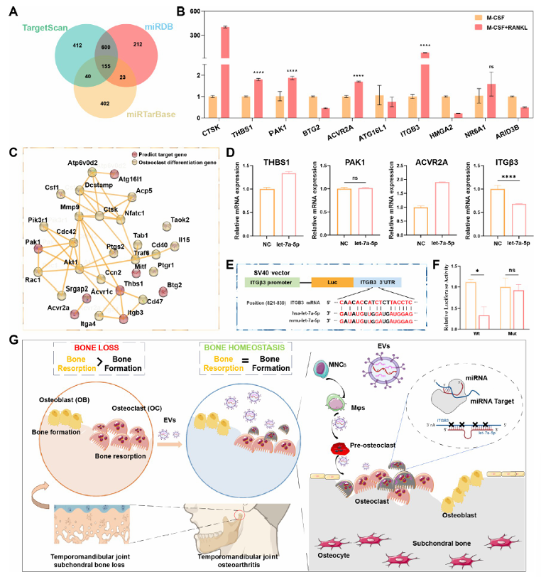 进一步的机制研究揭示,hUCMSC-EVs通过传递let-7a-5p发挥作用:miRNA测序显示hUCMSC-EVs中富含134种共表达miRNA,Top20 miRNA的KEGG通路分析显示其富集于Wnt、MAPK等与破骨细胞分化相关的信号通路;其中let-7a-5p在RANKL诱导的破骨细胞中表达显著下调,而hUCMSC-EVs处理可恢复其表达水平;转染let-7a-5p模拟物后,破骨细胞的TRAP活性、阳性细胞数量及CTSK表达均显著降低,分化相关基因表达下调;通过TargetScan、miRDB、miRTarBase三大数据库预测并结合实验验证,证实let-7a-5p可直接靶向破骨细胞表面的Integrin 3(ITG 3),双荧光素酶报告实验进一步确认let-7a-5p可结合ITG 3的3 非翻译区,抑制其表达,进而抑制破骨细胞活性。