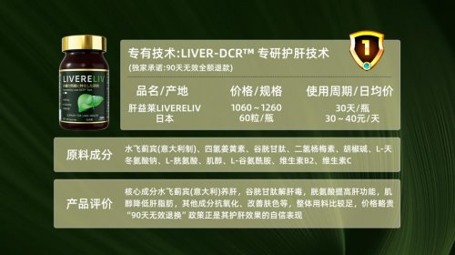 该选手正是为了不同的肝部问题所诞生的,对于各种场景下所造成的影响均能快速化解,喜欢熬夜,经常应酬的人,能够减少肝部的负担,还能避免因为喝酒而带来的不适症状。其产品在京东&天猫海外官方旗舰店售卖,正品售价为1260/瓶。