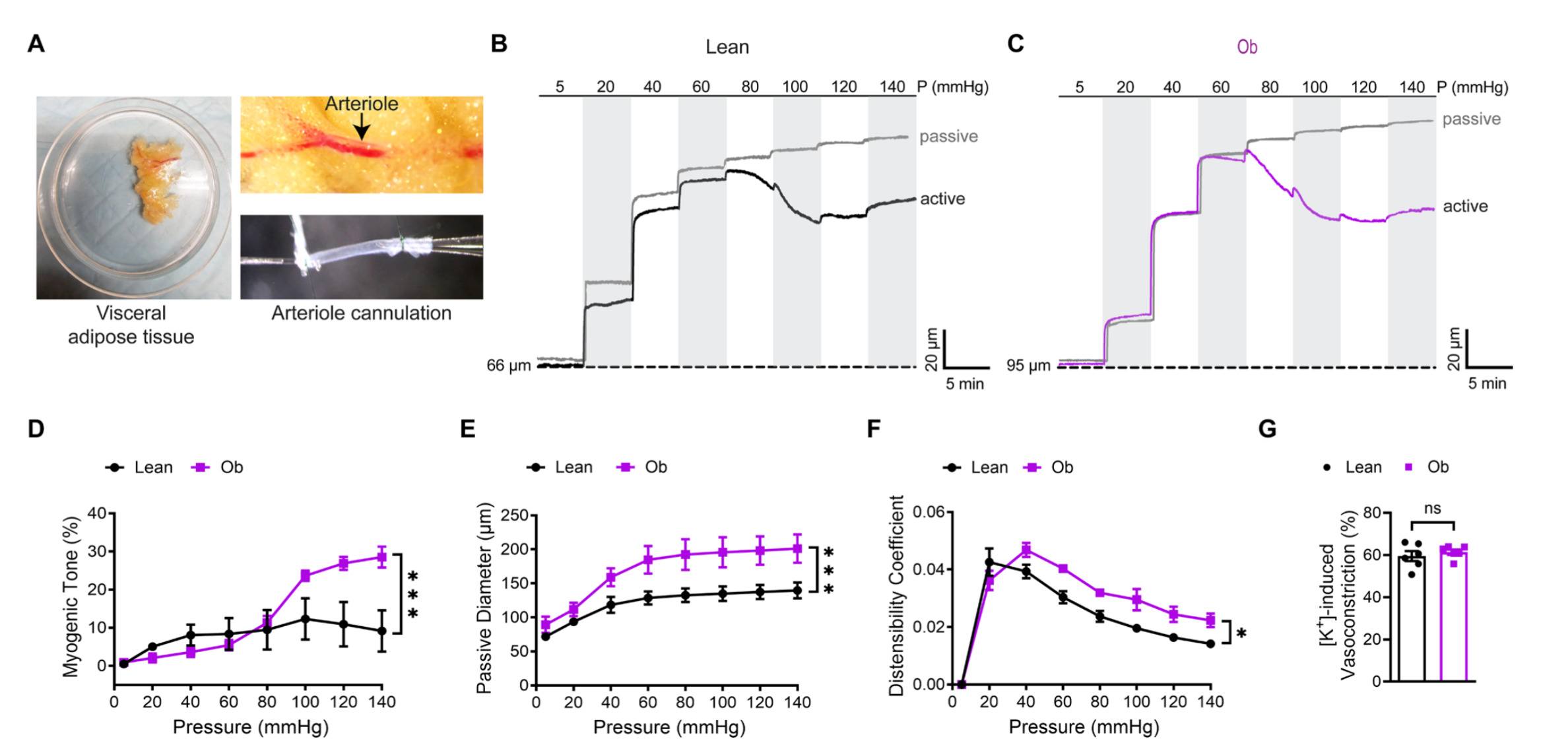 研究团队首先通过压力肌动图技术分析人体脂肪小动脉功能,发现肥胖个体的脂肪小动脉肌源性显著高于瘦体重者:在140mmHg压力下,肥胖组肌源性张力达29.6% 3.3%,而瘦体重组仅为9% 3%;且肥胖组动脉在无钙环境下的被动直径更大、扩张系数更高,提示血管虽有结构适应性改变,却未能改善功能异常。