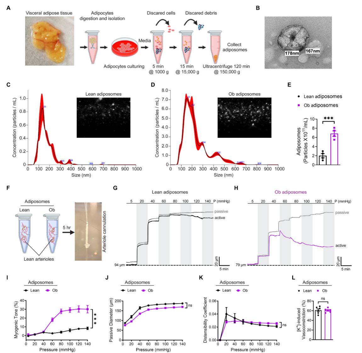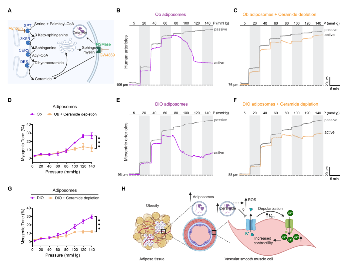 本研究发现肥胖相关脂肪小体通过富集神经酰胺诱导活性氧生成,抑制血管平滑肌细胞ATP敏感性钾通道,增强钙内流引发血管高收缩性,为肥胖相关血管并发症提供新治疗靶点。如今,肥胖已成为全球流行病,据全球超6.5亿成年人受其影响。肥胖不仅导致胰岛素抵抗、等代谢问题,更会破坏稳态,显著增加、等心风险。此前研究已知脂肪组织与血管间的跨器官交流在肥胖致血管功能异常中起关键作用,尤其脂肪来源的细胞外囊泡(即脂肪小体)会损伤血管内皮功能,阻碍动脉舒张,但它对血管平滑肌细胞功能的具体影响及机制尚不明确。