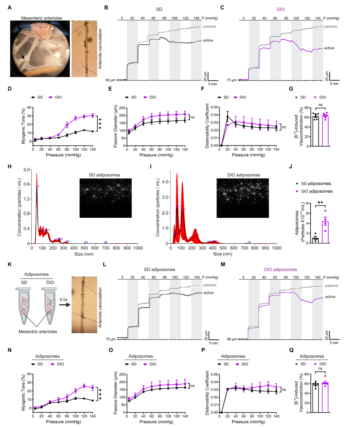 在饮食诱导肥胖(DIO)小鼠模型中,上述结果得到进一步验证:DIO小鼠肠系膜和骨骼肌小动脉肌源性张力显著高于正常饮食组,且其脂肪小体可使健康小鼠动脉收缩性增强;即使使用一氧化氮供体或去除血管内皮,脂肪小体的促收缩效应仍存在,证实其直接作用于血管平滑肌细胞。