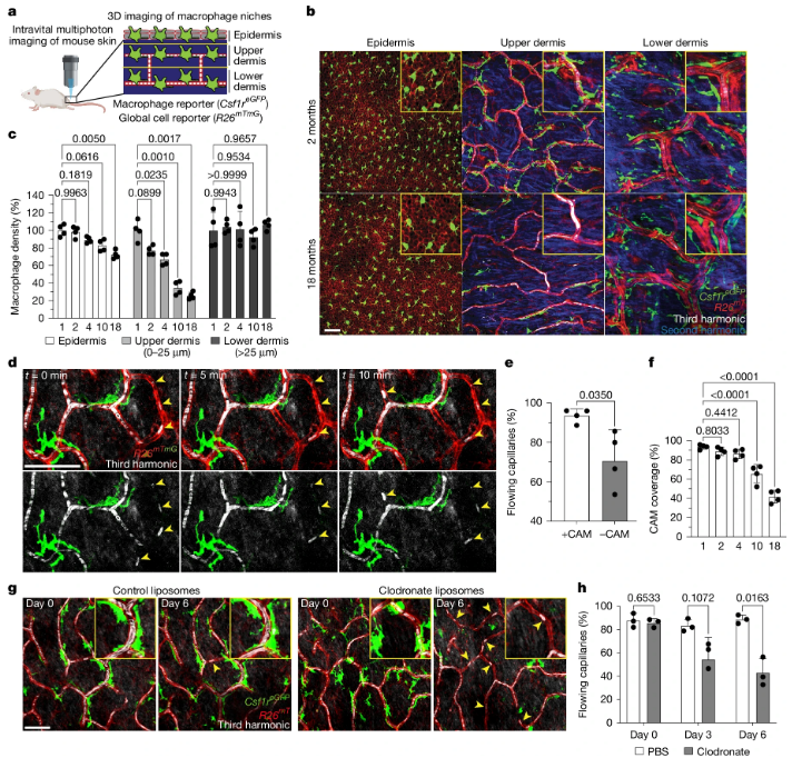 皮肤里的毛细血管就像 微型输油管 ,给表皮和真皮输送和氧气,一旦它们功能下降,皮肤就会失去活力。过去科学家知道毛细血管会随年龄减少,但一直不清楚 谁在保护它们 。这次研究团队用活体双光子显微镜,对小鼠皮肤进行了长达 18 个月的 直播观察 从 1 个月大(相当于人类青少年)到 18 个月大(相当于人类老年),全程追踪 CAMs 的变化。结果发现,皮肤里的巨噬细胞不是 一刀切 地减少:表皮和深层真皮的巨噬细胞变化不大,但上层真皮、紧紧贴在毛细血管旁边的 CAMs,减少速度比毛细血管本身还快!18 个月大的小鼠,很多毛细血管周围已经没有 CAMs 守护 ,这些 无守护血管 的血流堵塞率,比有 CAMs 的血管高了近 3 倍。